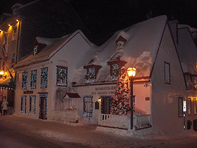 A delicious meal was had by all, and oh too soon we were back out in the cold of the night, walking around, taking in more views. Honestly I could so live there in the winter... even when it's not Christmas, there are trees and buildings lit up so wonderfully, as this pic will testify... Restaurant aux Anciens Canadiens.